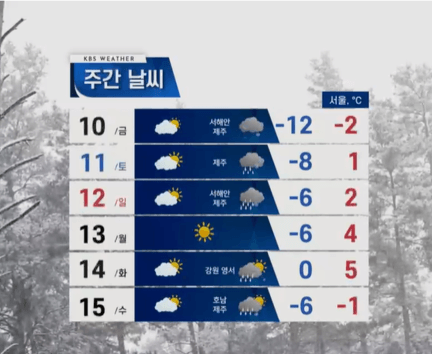 | 서울·경기 | 강추위, 도로 결빙 | 출퇴근길 안전 운전, 수도 동파 방지 |