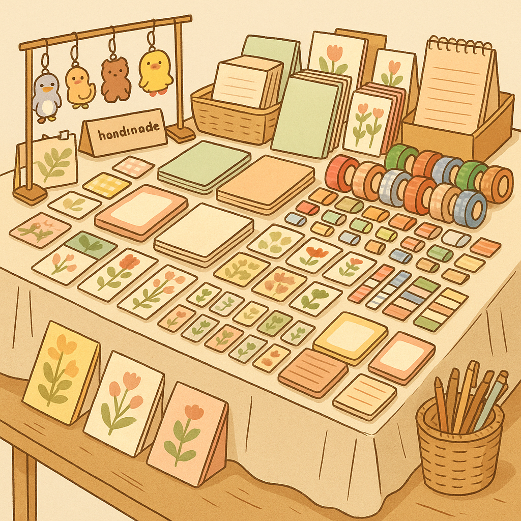 - 핸드메이드 문구 & 잡화: 직접 만든 아크릴 키링, 마스킹테이프, 인스(스티커), 떡메모지 등 문구 덕후들의 심장을 뛰게 할 소품들이 정말 다양해요.