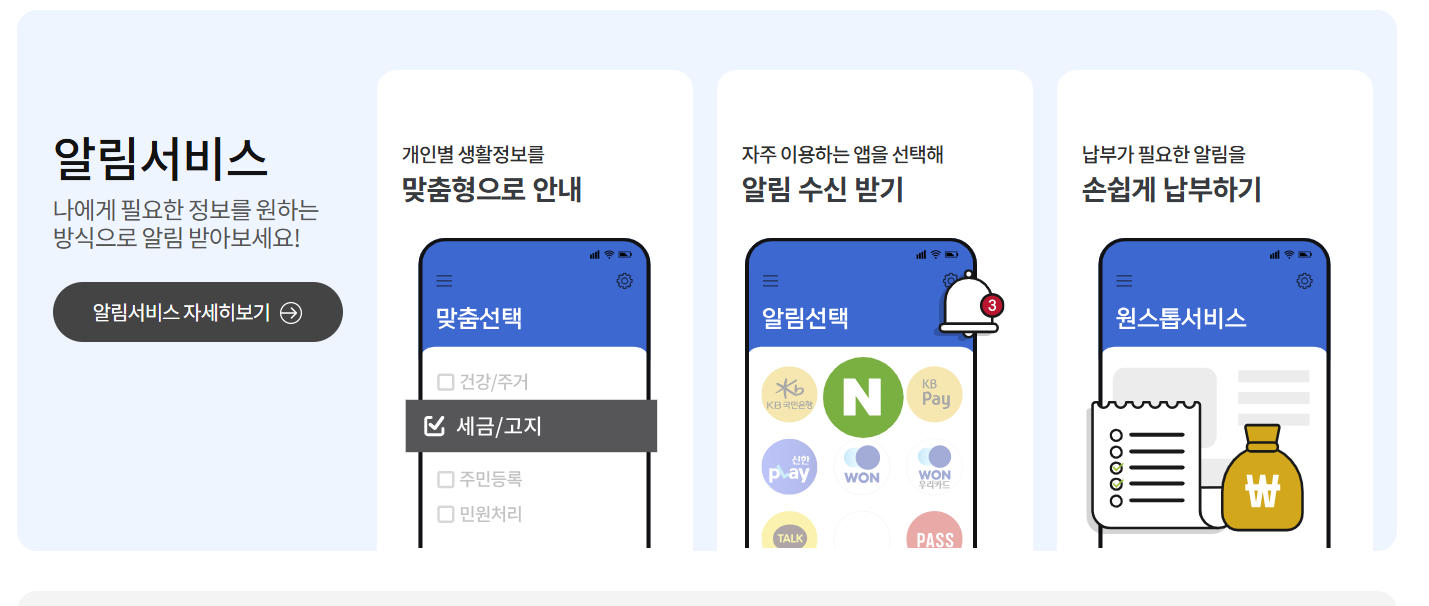✔ 건강검진·세금·지원금·교통 과태료 등 약 90여 종의 알림을 받을 수 있습니다.